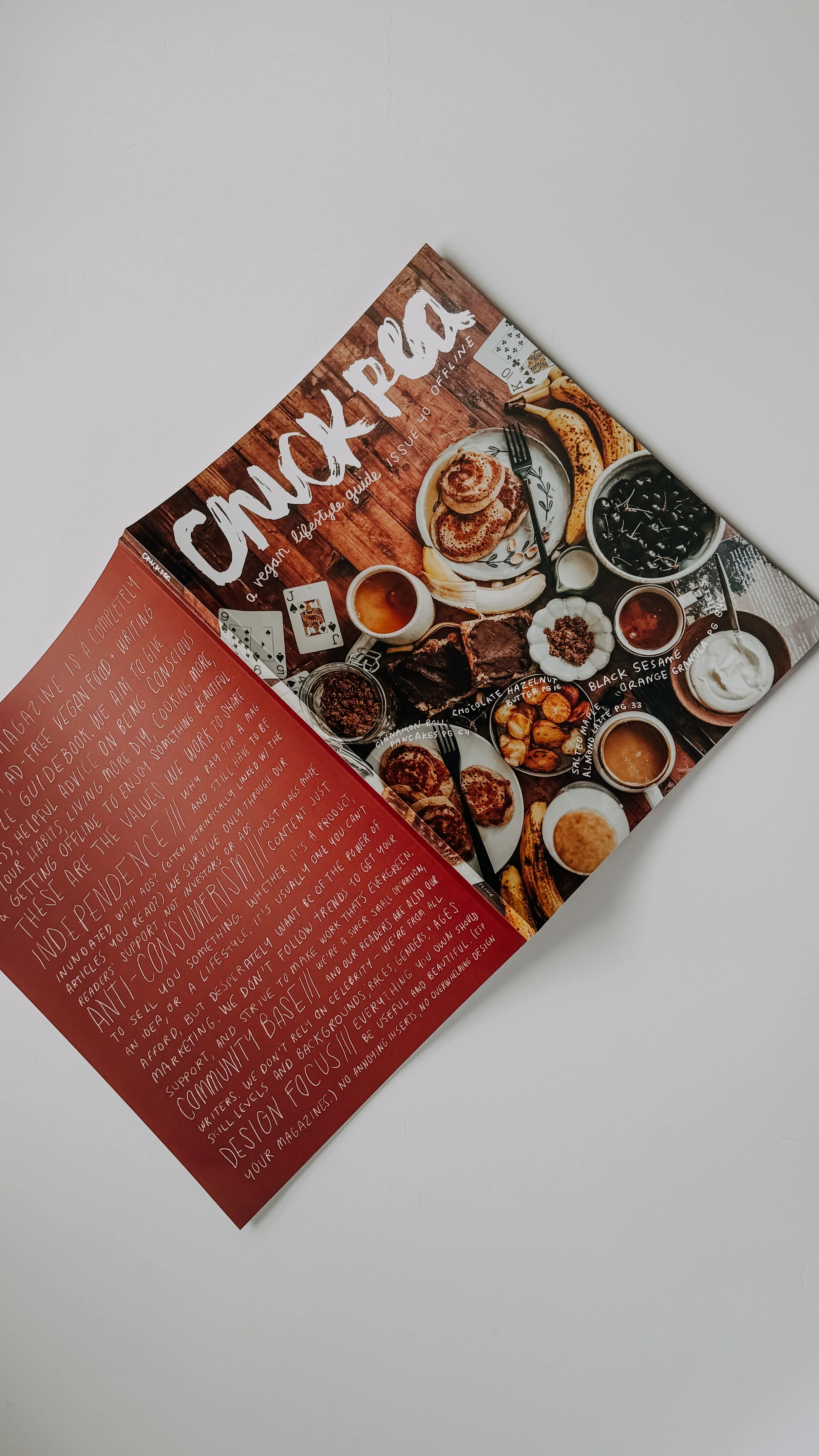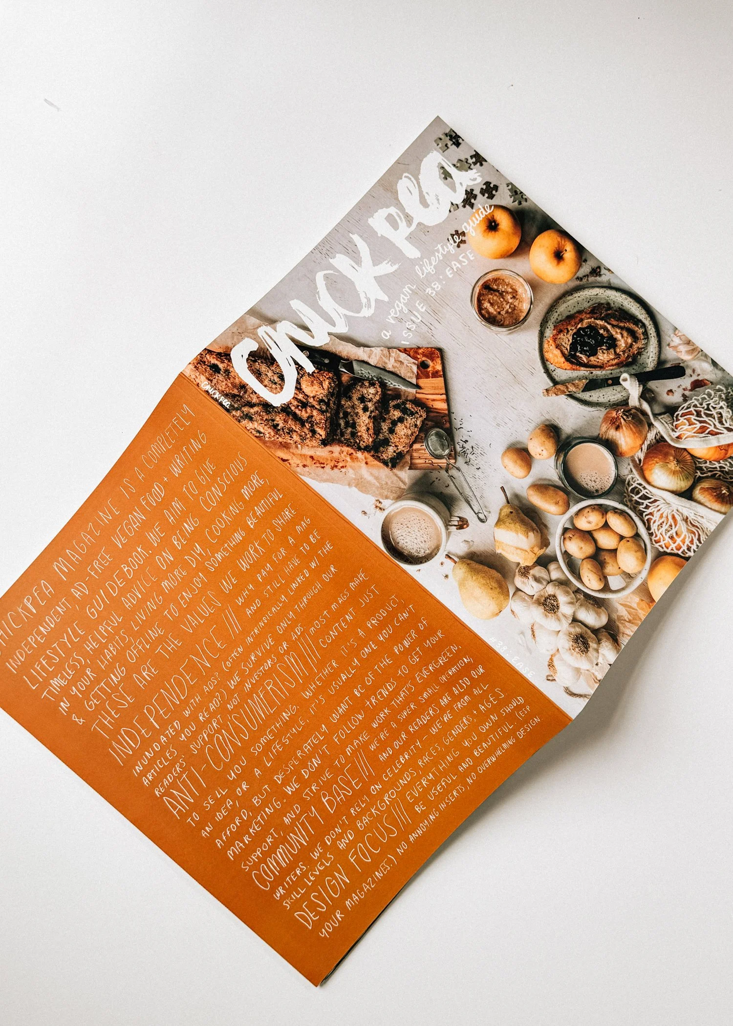 My work on Chickpea Magazine. I’m a part of every step of the process, from the concepting, to contributor management, writing, editing, recipe development, shooting, styling, lettering, design, printing, and selling.
